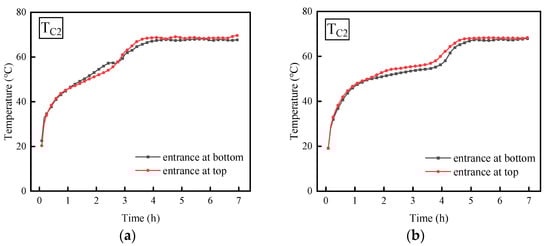 Figure 8a illustrates the effect of different water flow directions on the temperature of the PCM in a shell-and-tube thermal energy storage system. The system operates with a water temperature of 75 °C, a Type I tube as the outer tube, and an inclination angle of 45°. The temperature variation trends of the PCM under the two different water flow directions are fundamentally consistent, showing a rapid increase followed by a slower increase, and ultimately stabilizing. Additionally, the figure indicates that during the interval of 0 to 1.5 h, the PCM temperatures and melting rates under both water flow directions are identical, while after 3 h, the PCM temperature at the top inlet is slightly higher than that at the bottom inlet. To further validate this conclusion, with other conditions unchanged, the inclination angle of the shell-and-tube thermal energy storage system was adjusted from 45° to 90°, as shown in Figure 8b. Overall, the temperature variation trends of the PCM under both water flow directions remain fundamentally the same, and throughout the thermal energy storage process, the PCM temperature at the top inlet is consistently slightly higher than that at the bottom inlet. Both experiments yielded the same conclusion, indicating that regardless of whether the inlet is at the top or bottom, the impact on PCM melting is minimal.