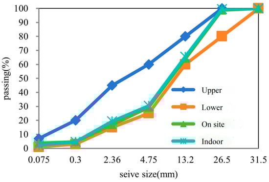To compare the performance of emulsified asphalt cold recycled mixture in-service and laboratory, the samples were formed in the laboratory using the materials and gradation in-service. The performance of the raw materials is delineated in Table 1. The gradation design persistently adjusts the ratios of well-graded coarse, medium, and fine RAP to align with the gradation of the in-service emulsified asphalt cold recycled mixture. The comparative analysis of the two gradations is presented in Figure 2. The mass of cement amounts, optimal emulsified asphalt content (OEC), and optimal water content are 2%, 3%, and 3.8%, respectively.