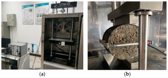 The mechanical performance was evaluated using indirect tensile strength and unconfined compressive strength. The indirect tensile strength is analyzed using the same method as the low-temperature splitting test, while the testing temperature was changed to 15 °C. The unconfined compressive strength test method is based on the Test Specification for Asphalt and Asphalt Mixtures in Highway Engineering (JTG E20-2011) [38]. The test temperature is 15 °C, the loading speed is 2 mm/min, and maximum load P at the time of sample failure is recorded. The unconfined compressive strength is calculated as Equation (10):