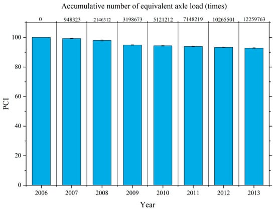 According to the evaluation standard for highway technical condition (JTG 5210-2019) [42], the damage rate of the emulsified asphalt cold recycled layer pavement is calculated and converted into PCI. The results are reported as the average value of PCI for every five test results on a 10 km section. The decay law of PCI of emulsified asphalt cold recycled pavement from 2006 to 2013 is shown in Figure 6. As can be seen from Figure 6, with the increase of service time and vehicle load times, the PCI of cold recycled pavement continues to decline. In the first service period (from 2007 to 2009), the PCI of cold recycled pavement decreased significantly, and the representative value of the test section PCI decreased from 100 to 94.9. During the later service (from 2009 to 2013), the PCI of cold recycled pavement decreased from 94.4 to 92.6. The PCI for in-service cold recycled pavement decreased rapidly at first and then more slowly later. The main reason for this phenomenon is that in the early stage of service, due to the low early strength of the cold recycled mixture, the old road base layer reflects cracks under the action of driving load, which to some extent affects the PCI value. However, after seven years of service, the PCI of cold recycled pavement is still excellent, indicating that cold recycled pavement has good durability.