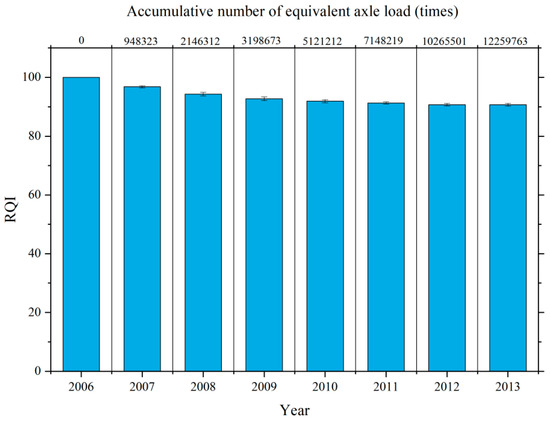 According to the evaluation standard for highway technical condition JTG 5210-2019 [30], RQI is used to assess the level of pavement smoothness. The IRI is measured using a laser profilometer, and then it is used in Equation (2) to calculate the RQI. The results are shown in Figure 8. From Figure 8, it can be observed that the variation trend of RQI for the cold recycled pavement is consistent with the PCI and RDI. It shows a trend of rapid decrease followed by slow decay. In the first service period (2007–2009), the RQI of the cold recycled pavement decreases significantly with the increase of service life. During the later service period (2010–2013), the RQI decreases from 91.9 to 90.1, with a decrease of only 1.8. Furthermore, after seven years of service, the pavement quality assessment result is still excellent, indicating that the emulsified asphalt cold recycled pavement has good durability and excellent service level.