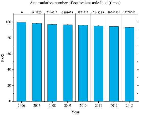 The measured deflection ratio is used in Equation (4) to calculate the PSSI, and the results are shown in Figure 9. From Figure 9, it can be observed that the PSSI of the emulsified asphalt cold recycled pavement continues to decrease with the increase of service life and cumulative standard axle passes. During the seven-year service period (from 2007 to 2013), the PSSI decreases gradually from 100 to 93.4. The pavement bearing capacity assessment result is excellent, which is consistent with the conclusions obtained from the previous tests of PCI, RQI, and PSSI. This indicates that the emulsified asphalt cold recycled pavement has excellent durability performance. The pavement performance does not show excessive decay with the increase of service life and cumulative standard axle passes.