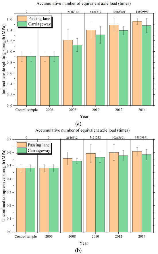 In addition, for the same service life of the emulsified asphalt cold recycled pavement, the splitting strength and unconfined compressive strength of the core samples from the passing lane were higher than those of the emulsified asphalt mixture in the carriageway. This is mainly because the lane coefficient of the passing lane is smaller than that of the carriageway. As a result, the passing lane bears less traffic load, resulting in lower damage.