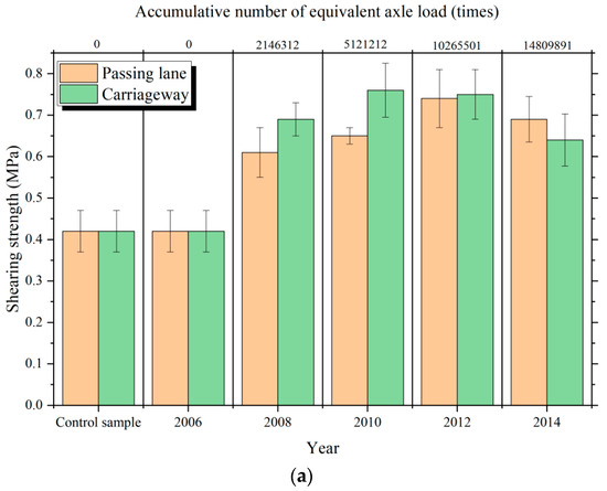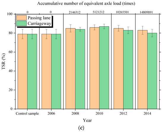 During the service period (2006–2014) of the emulsified asphalt cold recycled pavement, the performance of the in-service core samples from the carriageway, passing lane, and laboratory cold recycled mixtures were summarized in Figure 11.