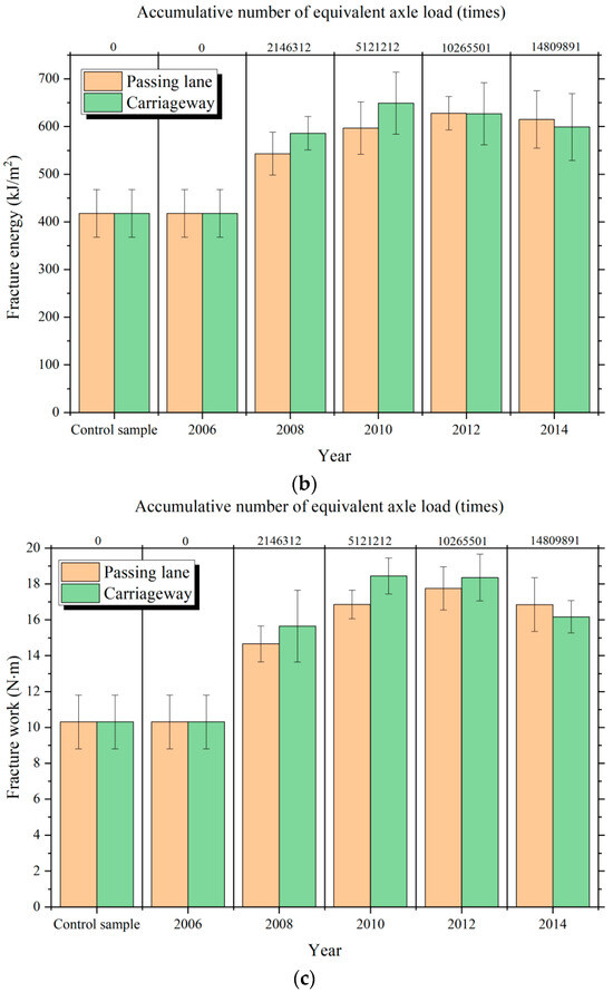 Changes in high-temperature and low-temperature performance of emulsified asphalt cold recycled pavement with service years and cumulative equivalent axes. (a) The test results of shearing strength, (b) The test results of fracture energy, (c) The test results of fracture work.