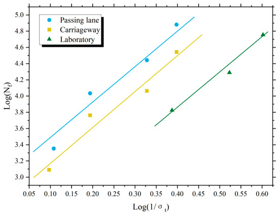 The relevance of the fatigue equations for the three types of cold recycled mixtures is very high, as evident from Equations (12)–(14). In the fatigue equation, the order of k parameter for different cold recycled mixtures from big to small is passing lane, carriageway and laboratory. This indicates that the passing lane has the highest residual fatigue. Therefore, it can be concluded that under the condition of the same maximum tensile stress at the center of the sample, the residual fatigue life of the passing lane for cold recycled mixture is greater than that of carriageway. It indicates that a greater number of axle load cycles will lead to a decrease in the fatigue life of in-service cold recycled mixtures. The laboratory cold recycled mixture does not bear the load of vehicle traffic. In theory, its fatigue life should be higher than that of in-service cold recycled mixtures. However, the fatigue equation shows that the fatigue life of the laboratory cold recycled mixture is lower than that of in-service cold recycled mixtures. It shows that there is a process of fatigue life growth for emulsified asphalt cold recycled mixtures during their service after laying. Previous studies [38,43,44] have demonstrated that the strength of emulsified asphalt cold recycled mixture increases after 2–5 years of service, and reaches a stable level after 2 to 5 years. The results of this study are consistent with this conclusion. This situation may be due to the long bonding and infiltration time of old materials and asphalt in in-service cold recycled mixtures, resulting in stronger interfacial bonding force and a longer fatigue life [45]. In contrast, in newly formed cold recycled mixtures, the interaction time between old materials and asphalt is short, resulting in weak interfacial bonding force and a shorter fatigue life.