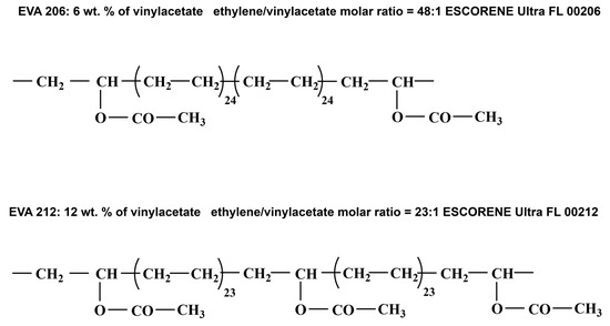 Two different ethylene vinyl acetate copolymers were used in this study: EVA 206 and EVA 212. The chemical structure of these copolymers is shown in Figure 1.