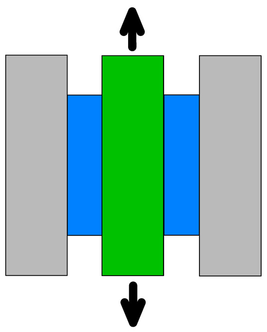 The shear test configuration in the dynamic mechanical analyzer. Two samples (blue rectangles) are sheared between static metal plates (gray rectangles) and a moving central component (green rectangle). The black arrow indicates the movement of the central component, which is used to measure the material’s response in .