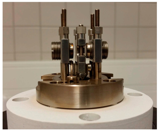 Two tests were performed in the dynamic mechanical analyzer DMA-1 STARe System METTLER TOLEDO Switzerland machine (Mettler-Toledo (Switzerland) GmbH, Greifensee, Switzerland) to determine the material’s creep, frequency sweep (0.1–100 Hz), and stress–strain behaviors. Tests were carried out at 25 °C and 150 °C using shear deformation on two samples with a size of 11 mm × 11 mm × 1 mm. Conditions for the creep test in static mode were 1 min at 0.05 N, 5 min at 1.00 N (creep), and 5 min at 0.05 N (recovery). Stress–strain tests utilized a 0–2 N force range with a 0.4 N/min rate, and shear stress was assessed at a shear strain of 0.03. Figure 2 and Figure 3 show shear mode testing in the dynamic mechanical analyzer, METTLER TOLEDO, Greifensee, Switzerland. After the testing, the results of three measurements were always averaged. These measurements are very sensitive to the crosslinking level performed by various methods listed in Appendix A.