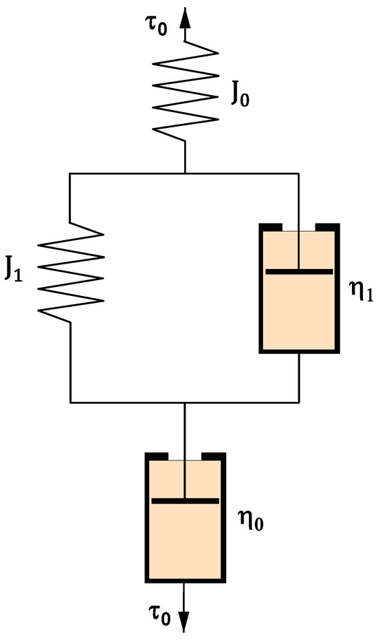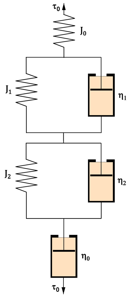 As depicted in Figure 4, the four-parameter Burger model consists of two springs with instantaneous shear compliance and retarded compliance and two dashpots with viscosities and . The mathematical expression for this model is given in Equation (1) [35]. The six-parameter model comprises a Maxwell element (spring and dashpot in series) in series with two Kelvin elements (spring and dashpot in parallel) (Figure 5) [33,36].