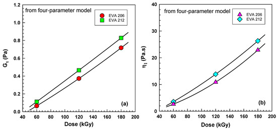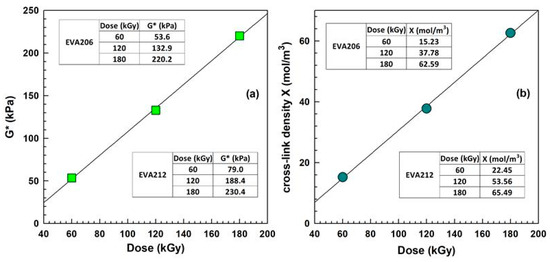 Figure 6a shows the complex shear modulus , which increases linearly with dose, and its values are higher for EVA 212.