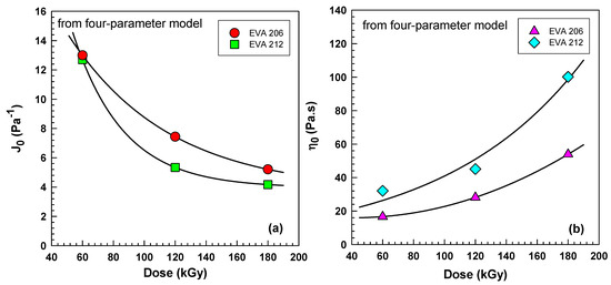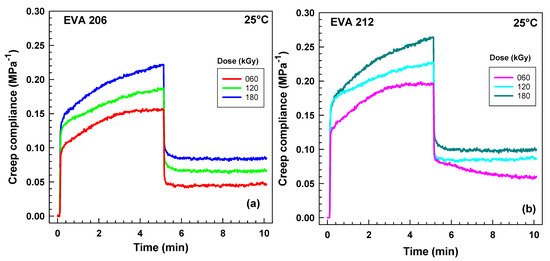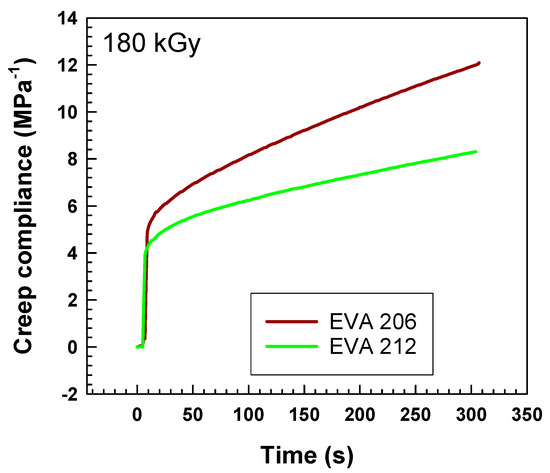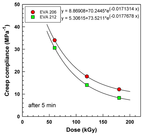 When we read the values of creep compliance after 5 min shown in Figure 10, we can plot them as a function of dose. As illustrated in Figure 10, irradiation causes an exponential decay of these values with increasing irradiation. All the values are lower for EVA 212, indicating higher crosslinking.