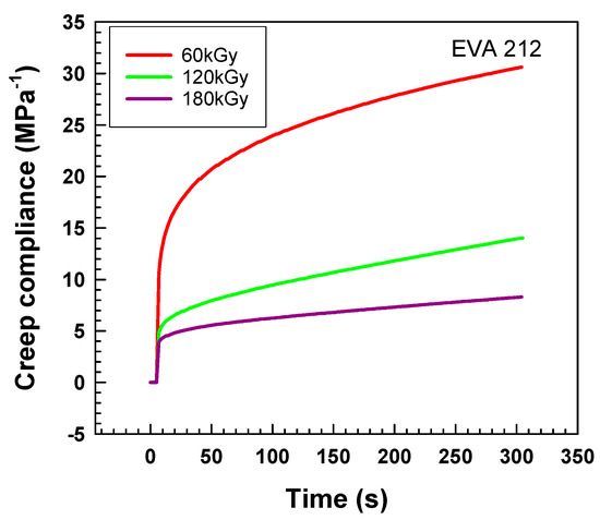 Figure 8 shows the creep compliance of EVA 212 as a function of time for three radiation levels (60, 120, 180 kGy). The highest creep was detected for the lowest irradiation (60 kGy). With increasing radiation level, creep compliance gradually decreases. This result implies effective crosslinking. These results are consistent with the findings of Dutta et al. who observed a significant decrease in creep of EVA/TPU blends after crosslinking by electron beam radiation [42]. Auhl et al. observed the same trend for a higher radiation level of long-chain branched polypropylene by electron beam irradiation [30].