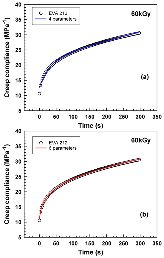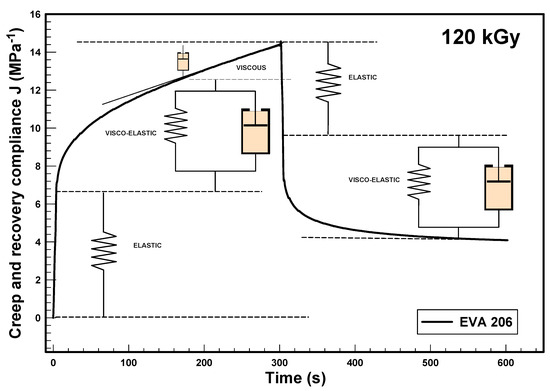 Figure 9 illustrates creep compliance curves for EVA 206 and EVA 212, both irradiated at a level of 180 kGy. The instantaneous creep compliance , represented by a spring element in the model, was approximately 4.9 MPa−1 for EVA 206 and about 3.9 MPa−1 for EVA 212. The subsequent creep behavior is described by a fully reversible viscoelastic Kelvin model (a parallel arrangement of a spring and a dashpot) and an irreversible viscous flow represented by a separate dashpot. After a period of 5 min, the total creep compliance values reached 12.1 MPa−1 for EVA 206 and 8.3 MPa−1 for EVA 212.