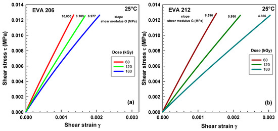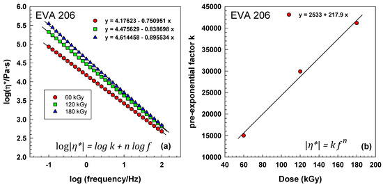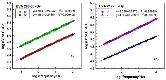 Figure 6b shows crosslink density X at a frequency of 0.1 Hz calculated according to Equation (5). It grows linearly with irradiation. The calculated values of crosslink density are higher for EVA 212.