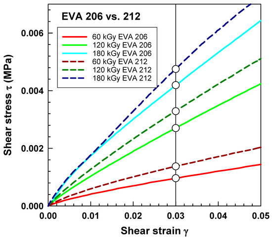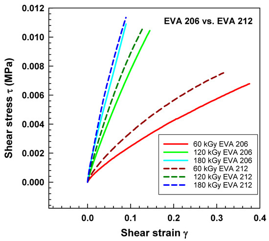 Unlike previous studies, this research systematically evaluates the high-temperature creep compliance, frequency sweep, and stress–strain relationships of EVA copolymers as a function of irradiation dose and vinyl acetate content. The standard mechanical test is typically performed below the melting point of the crystallites (at 20 °C). At these temperatures, intercrystallite chains form structures with maximum molar mass, and crosslinking occurs between chains connected to different crystallites [28]. The cross-link density at a given irradiation dose depends on the level of amorphous material in EVA. Crystalline regions were only slightly affected by irradiation [18]. The crosslinking takes place in the amorphous region and the surface of the lamellae of the semicrystalline polymer [29]. Testing at temperatures above the melting point eliminates physical crosslinking due to the absence of crystal lamellae. Auhl et al. investigated creep for polypropylene at 180 °C [30].