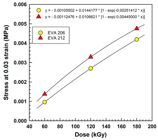 Matsui et al. [58] investigated mechanical changes in the electron-beam irradiated ethylene vinyl-acetate copolymer. EVA had 5, 9, and 15 wt.% of VA. The electron beam irradiation was in the range of 0–200 kGy.