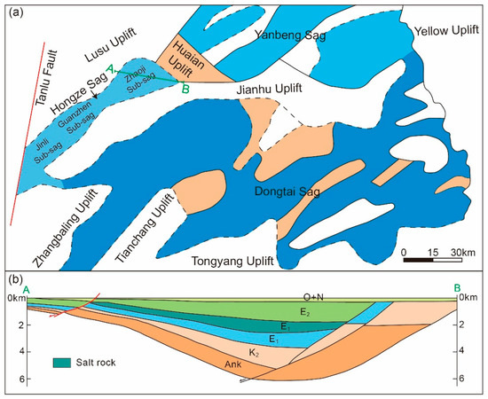 - Zhang, M. Study on the Origin and Distribution of Saline Sediments of E1f4 in Zhaoji Sag, Hongze Depression, Northern Jiangsu Basin. Master’s Thesis, China University of Petroleum (East China), Qingdao, China, 2014. (In Chinese with English abstract). [Google Scholar]