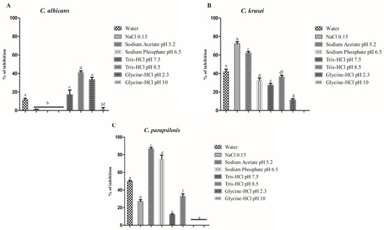 Regarding the antimicrobial activity, although there were differences in protein content, all extracts were tested for antimicrobial activity. All the extracts were tested at a concentration of 50 µg mL−1. At the concentration tested, none of the extracts presented antibacterial activity. In contrast, they were active against Candida spp. (Figure 1). Against C. albicans, Tris-HCl pH 8.5 was the best by inhibiting 40% of its growth (Figure 1A). In the case of C. krusei, the best extracts were those made with 0.15 M NaCl and 0.05 M of sodium acetate pH 5.2 by inhibiting, respectively, 75% and 60% the growth (Figure 1B). Regarding C. parapsilosis, the best activity was found in the extract produced with 0.05 M of sodium acetate pH 5.2, achieving inhibition of 85% (Figure 1C). Based on these results, the proteins extract with 0.05 M of sodium acetate pH 5.2 was chosen to move forward in the studies of mechanisms of action against C. krusei and C. parapsilosis and protein characterization and identification.
