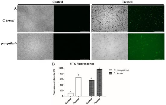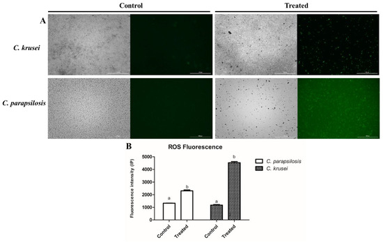 ROS overaccumulation in Candida cells induced by proteins from K. alvarezzi. (A) Images of the fluorescence intensity of C. parapsilosis and C. krusei with the control (DMSO) and proteins from. K. alvarezzi, and (B) relative fluorescence intensity values of the comparison between the DMSO group and the group treated. The data are shown as the mean and standard deviation of three independent experiments. Different letters indicate statistical significance (p < 0.05) between the treatment and control groups. White bars: 100 µm.