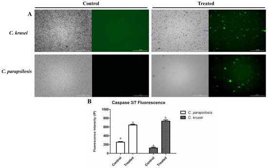 Protein from K. alvarezzi induced apoptosis in Candida cells mediated by caspase 3/7. (A) Images of the fluorescence intensity of C. parapsilosis and C. krusei with the control (DMSO) and proteins from K. alvarezzi, and (B) relative fluorescence intensity values of the comparison between the DMSO group and the group treated. The data are shown as the mean and standard deviation of three independent experiments. Different letters indicate statistical significance (p < 0.05) between the treatment and control groups. White bars: 100 µm.