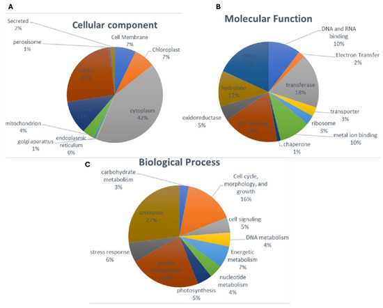 The antimicrobial assays revealed the biotechnological potential of proteins extracted from K. alvarezzi. Based on that, our further experiments focused on identifying the proteins in the extract. The LC-MS/MS analysis identified 336 proteins in the extract of K. alvarezzi extracted with sodium acetate buffer (Supplementary Table S1). The proteins identified cover all cellular compartments and develop several molecular functions in K. alvarezzi’s cells (Figure 7A,B). The biological processes displayed by those proteins are carbohydrate metabolism (3%), cell cycle, morphology, and growth (16%), cell signaling (5%), DNA metabolism (4%), energetic metabolism (7%), nucleotide metabolism (4%), photosynthesis (5%), protein metabolism (27%), stress response (6%), and unknown (27%) (Figure 7C).