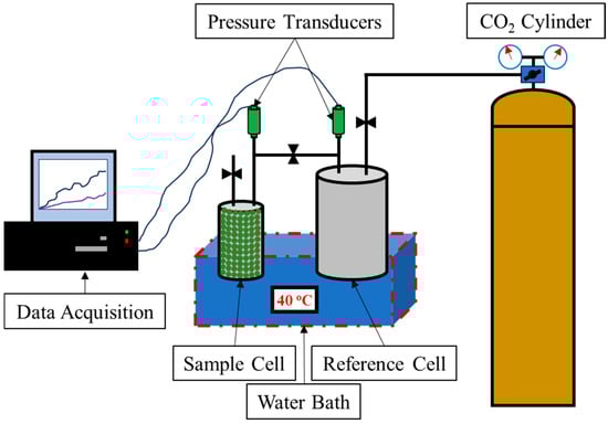 An illustration of the experimental setup used to conduct all the experiments is shown in Figure 1. The setup is composed of a volumetric adsorption setup composed of a sample cell that houses the fly ash sample, a reference cell that houses the CO2 initially before expansion, pressure transducers to record the pressure, and a water bath to maintain constant temperature for the duration of the experiment. The transducers were calibrated based on the recommendation of the manufacturer by zeroing the transducer before conducting the experiment. This was conducted through the software. Once zeroed, the temperature reading was ensured to be similar to that of the room temperature to ensure that the transducers were functioning correctly. The CO2 is provided through a high-pressure CO2 cylinder with a pressure regulator to control the flow of CO2. The pressure transducers are connected directly to a computer to log and record the pressure values for the duration of the experiment. The logging system has an accuracy of four decimal places and can log four pressure readings every second.