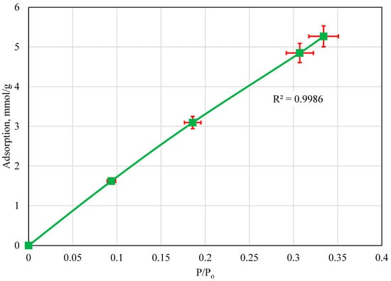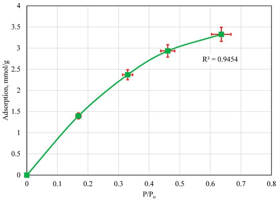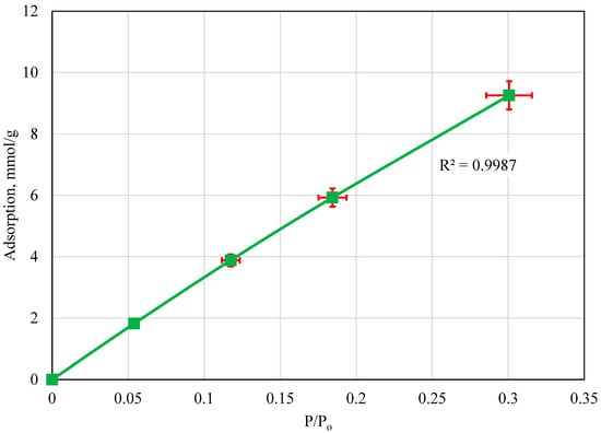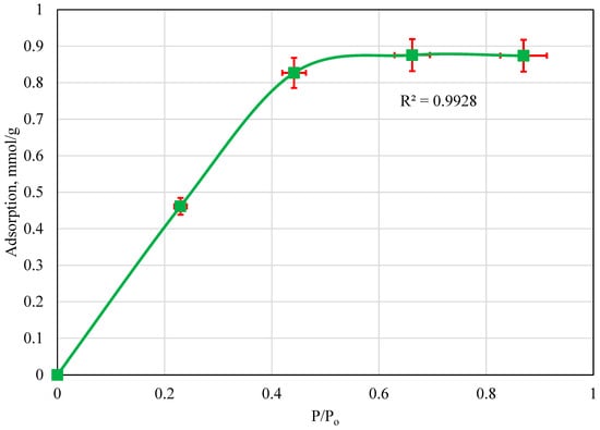 The initial CO2 adsorption isotherm was developed at a temperature close to the average room temperature in Egypt, 23 °C. The saturation pressure of the CO2 at 23 °C was determined mathematically to be 903.6 psi. Based on this, adsorption was measured at different pressures and then divided by the saturation pressure to develop the isotherm. The CO2 adsorption isotherm using the volcanic fly ash sample at 23 °C is presented in Figure 2. Initially, the adsorption behavior is linear until a pressure ratio value of 0.44. Beyond this, the adsorption capacity seems to normalize at a value of 0.875 mmol/g. Based on these results, initially, as the pressure increased, more CO2 could adsorb to the fly ash sample. Once the maximum adsorption capacity at 23 °C was reached, increasing the pressure had no impact on CO2 adsorption; therefore, the adsorption isotherm plot normalized at the maximum adsorption value for the volcanic fly ash at this temperature.