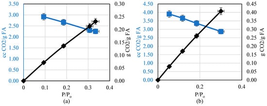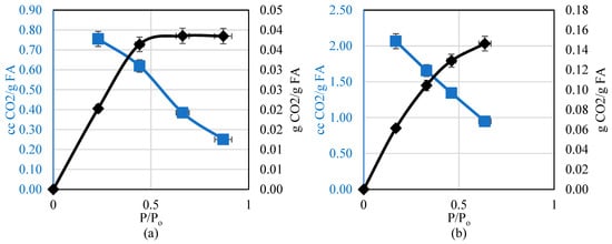 In order to show the difference between mass-based adsorption behavior (gravimetric adsorption) and volume-based adsorption behavior (volumetric), the adsorption isotherms were converted from moles to cubic centimeters (mL) and grams of CO2 per gram of fly ash. For all the results, the mass behavior follows the same behavior as the molar mass, while the volume behavior follows an opposite trend.