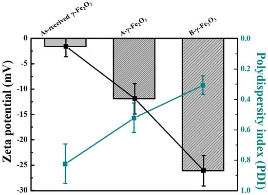 Figure 2 presents the zeta potential and polydispersity index (PDI) values measured to evaluate the dispersion stability of the as-received γ-Fe