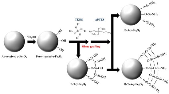 17]. However, the combined influence of acid/base pretreatments, TEOS interlayers, and subsequent APTES grafting in γ-Fe