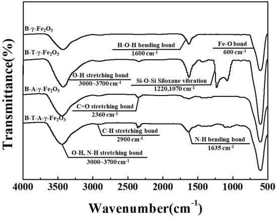 To provide a comparative assessment of amine group incorporation, the FTIR absorption bands corresponding to N–H bending (~1635 cm−1) and C–H stretching (~2900 cm−1) were qualitatively evaluated relative to the Fe–O stretching band at 570 cm−1. The B-T-A-γ-Fe2O3 sample exhibited noticeably stronger N–H and C–H signals than the B-A-γ-Fe2O3 sample, indicating a higher level of surface amine functionalization. Although not quantitatively determined, this relative enhancement supports the conclusion that the TEOS-mediated silica interlayer promotes more effective and homogeneous APTES grafting.