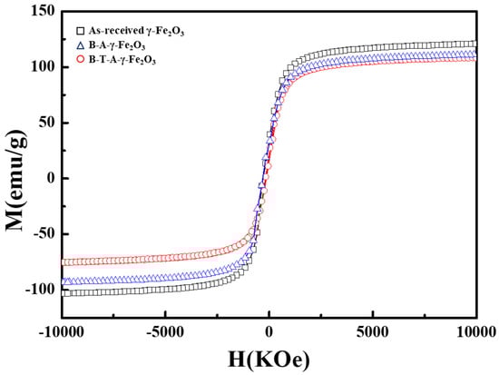 The as-received γ-Fe2O3 nanoparticles exhibited a high saturation magnetization (Ms) value of 121.48 emu/g. After surface modification with APTES, the Ms values of B-A-γ-Fe2O3 and B-T-A-γ-Fe2O3 samples were slightly reduced to 111.24 and 109.81 emu/g, respectively.