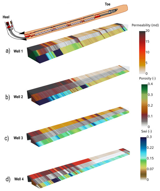 Reservoir heterogeneity: (a) Well 1—slotted liner, (b) Well 2—AICD, (c) Well 3—AICD, and (d) Well 4—ICD (0.5 ft logging resolution).
