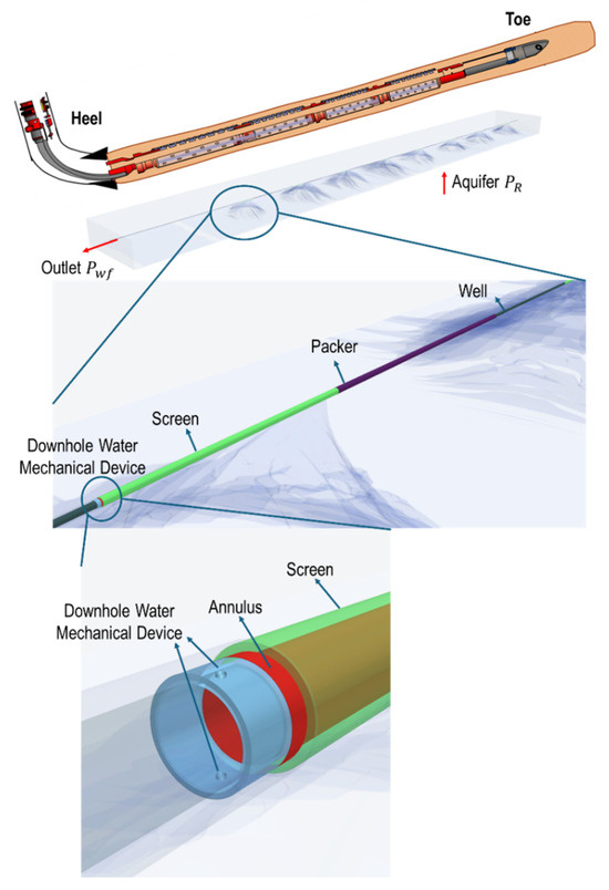 Parallelly, rapid advancements in computational capabilities have facilitated a deeper understanding and more detailed design of Downhole Water Mechanical Devices through Computational Fluid Dynamics (CFD) studies. Conventional CFD codes typically solve the complete set of Navier–Stokes equations in 3D, coupled with closure relations, enabling more detail on the multiphase flow phenomena occurring near the wellbore and directly within the well. This advanced level of detail has been thoroughly demonstrated in recent CFD investigations [27,28,29,30,31]. Moreover, they can explicitly depict the flow dynamics between the reservoir (near wellbore) and the well down completion with or without different Water Control Devices, either static or dynamic. The flow dynamics coupling well and reservoir systems have been extensively investigated [31,32,33,34,35], focusing on reservoir heterogeneities, formation damage, annulus configurations, and performance comparisons between Water Control Devices and conventional technologies like sand screens.