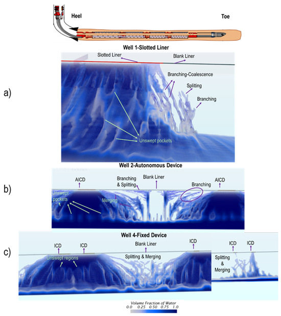In contrast, the displacement front near the autonomous and fixed devices exhibits notable differences owing to the substantial reduction in inflow area. As illustrated in Figure 6b,c, the absence of strong crests observed in Well 1 is notable. Still, it was replaced by a robust water inflow beneath each Downhole Water Mechanical Device’s inflow area. However, pockets of unswept oil are still discernible in this region. Meanwhile, swell packers restrict fluid inflow to the well between the autonomous devices, effectively isolating each section or compartment. Beneath these sections, channeling is marked by significant instability, featuring pronounced side branching and subsequent coalescence with stronger water channels. Despite experiencing the lowest pressure gradient due to isolation between the well and the reservoir, these observations pinpoint the challenges associated with high water production in heavy oil wells.