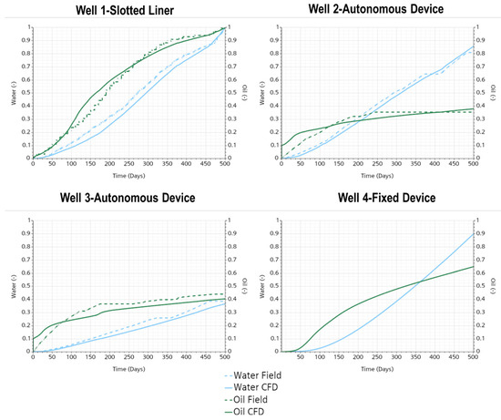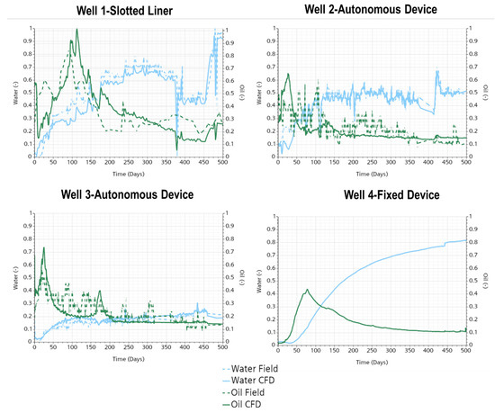 As a final comparison, the production profiles for the different wells are depicted in Figure 8, where the CFD models were fine-tuned to closely resemble water and oil production data with an average deviation of 10% and 16%, respectively. This level of detail was achieved by using the reported field data and the reservoir heterogeneity reports. The tuning process primarily involved adjusting the initial phase volume fractions within the well. The distribution of these phases significantly influenced the sensitivity of the production profiles, particularly during the initial production days. Among the studied cases, Wells 1 and 4 exhibited higher water production than Wells 2 and 3 due to their inability to choke the inflow of fluids.