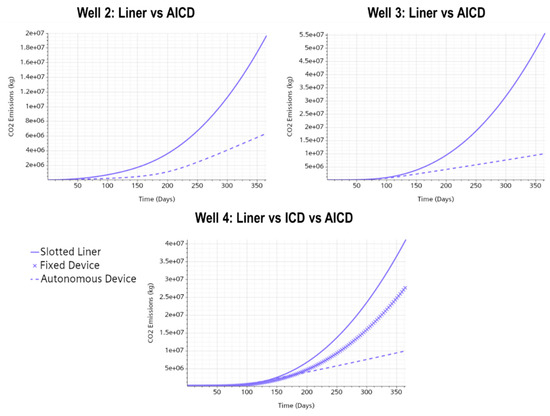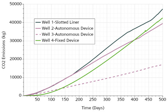 Regarding the carbon footprint, Figure 17 presents the emission profiles for the different wells using different water inflow control technologies. Similar to the results previously presented in Section 3.1.1, carbon emissions are reduced when fixed or autonomous inflow technologies are implemented. For example, the fixed device study case reduced emission compared to conventional slotted liners, while the autonomous devices reduced the carbon emissions between and . Again, the reduction in the carbon footprint is attributed exclusively to a decrease in excessive water production and, in the AICD cases, to the choking of fluids, which avoids their exponential production.