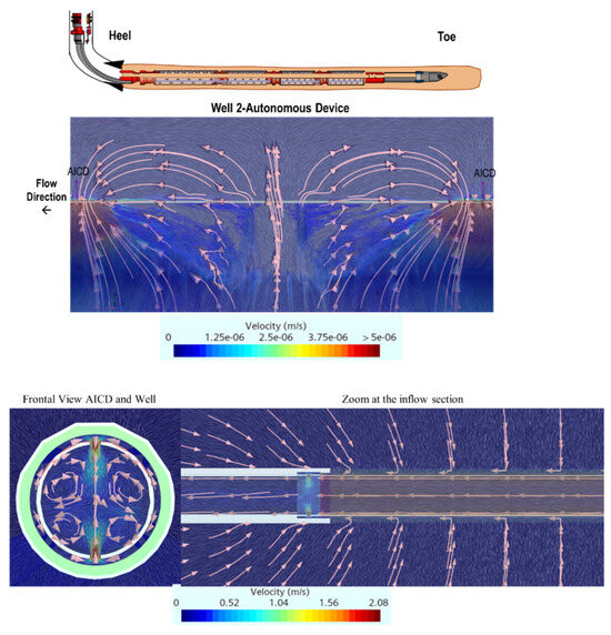 Key features observed in such studies include explicit modeling of single- and multiphase flow dynamics, numerical calculations of friction and obstruction losses, turbulence effects, material erosion analysis, fluid–solid interaction, and performance curve derivation. Examples of CFD-assisted design for diode-type AICDs are documented in [14,36,37], while passive ICD and alternative AICD configurations are examined in [18,38,39,40,41,42]. Additionally, coupled CFD and fluid–solid interaction (FSI) simulations of moving-part valves (e.g., RCP types) are demonstrated in [43].