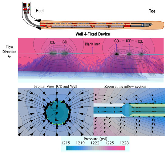 One of the advantages of directly coupling the reservoir and the well with CFD modeling is the ability to describe the hydrodynamic behavior and integration between the reservoir, the annulus, and the well itself. This is particularly beneficial for capturing the dynamic changes in fluid properties within the well as the water-cut progressively increases, influencing the hydrodynamic profile along the well. Figure 11 illustrates an example of the velocity field and streamlined behavior in the Well 2 reservoir and the well after 500 days in a section completed with autonomous devices with pronounced channeling. Additionally, Figure 12 depicts the pressure profile for Well 4, utilizing ICD, to compare and illustrate the pressure gradients in the reservoir, completion, and the well.