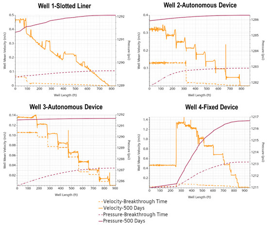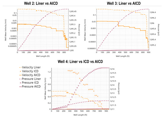 Regarding the pressure in the well, the profiles display consistent disparities related to the influence of the inflow technology, with the lowest pressure drop achieved with AICD due to the choking effect. However, ICD technology for Well 4 exhibited the most significant pressure gradient, 33% higher than its slotted liner counterpart, despite having the same drawdown.
