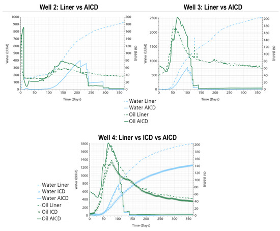 On the contrary, Well 4, which compared three different completion technologies, revealed that ICD technology also reduced water production, albeit to a lesser extent than AICD. In this scenario, ICD resulted in 1.49 times less water production than slotted liners, whereas AICD proved more efficient, reducing water production by 12.26 times. Conversely, oil production favored slotted liners, followed by ICD, while AICD exhibited the lowest oil production due to valve choking. Specifically, ICD yielded 12.14% less oil than slotted liners, whereas AICD yielded 46.82% less oil.