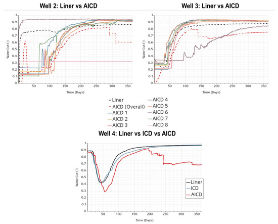 Water-cut profiles for the different completion technologies and some individual AICDs.