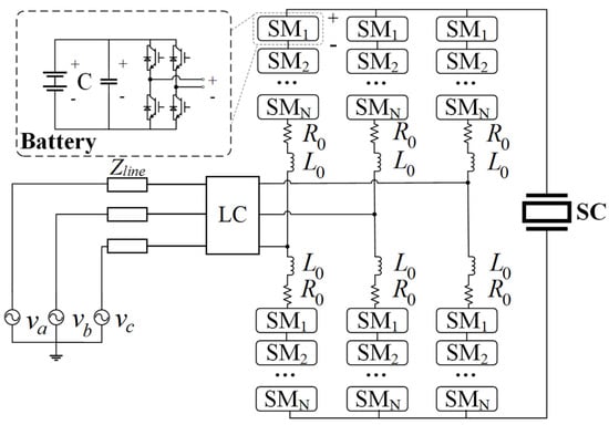 The main circuit topology of MMC-HESS [20] is shown in Figure 1. It features a three-phase bridge arm, each phase consisting of two upper and lower bridge arms, connected by the bridge arm impedance, i.e., the bridge arm inductance L0 and bridge arm resistance R0. Both the upper and lower bridge arms are cascaded with an equal number of identical submodules (SMs), where each submodule is a parallel structure that includes a battery, a full-bridge converter, and a parallel capacitor to control the rate of change of the DC-side voltage during the switching process of the converter bridge. The communication side terminals are drawn from the connection impedance midpoint of each phase’s upper and lower bridge arms and then connected to the grid through an LC filter and line impedance. The necessity of the LC filter depends on the modulation strategy and the number of submodules per arm and is generally not mandatory. The supercapacitor is formed by connecting multiple capacitor cells in series on the DC side.