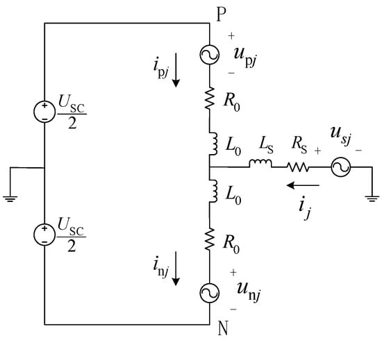 The single-phase equivalent circuit for three-phase symmetrical operation is illustrated in Figure 2, where usj denotes the AC voltage on the grid side; upj and ipj represent the voltage and current of the upper bridge arm, respectively; unj and inj represent the voltage and current of the lower bridge arm, respectively; USC represents the terminal voltage of the DC-side supercapacitor.