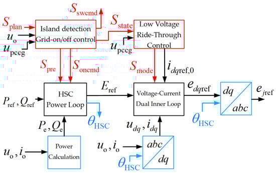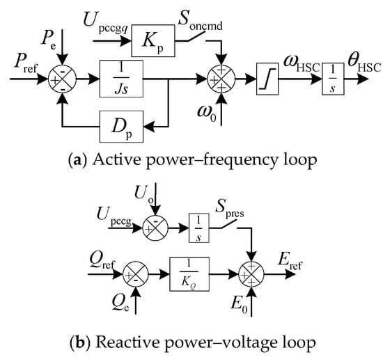 In summary, the HSC power control loop for both grid-connected and islanding control is shown in Figure 3, including the active power–frequency loop and reactive power–voltage loop.