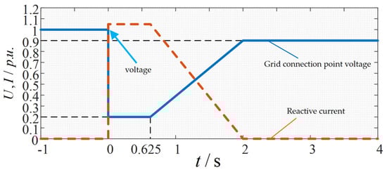 According to Equation (10), the HSC reactive voltage loop cannot meet the reactive current curve and has a slow response. Therefore, during voltage sag, the q-axis current reference value output by the q-axis voltage loop should be switched to the reactive current curve shown in Figure 4. However, after switching the iqref, the d-axis voltage loop will no longer track the reference without static error. Therefore, the d-axis current reference value needs to be switched simultaneously; the switched current reference value is:
