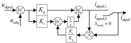 After fault recovery or islanding operation, the fault current-limiting mode is exited. To reduce the impact current after switching modes during grid connection, the fault current-limiting mode will continue until ωHSC stabilizes. The voltage loop PI controller will be improved to a compensatable PI controller, as shown in the control block diagram in Figure 5.