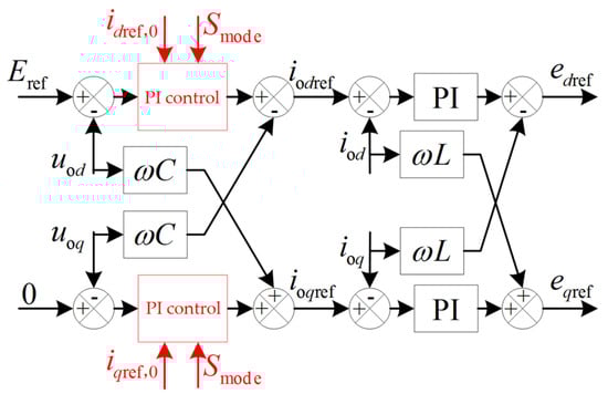 In the voltage control loop, which includes the PI compensating controller and LC filtering capacitor decoupling term, as shown in Figure 6, the current reference values iodref and ioqref are obtained based on the dq-coordinate voltage reference Eref, 0, and the actual values uod, uoq. In the current control loop, which includes the traditional PI controller and LC filtering inductance decoupling term, the dq-coordinate reference values for the AC equivalent electromotive force edref, eqref are calculated from the current reference values iodref, ioqref and their actual values iod, ioq.