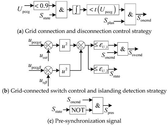The grid connection and island operation control strategies, as well as the islanding detection strategy, are shown in Figure 7. In Figure 7, the following symbols are used: Splan, Soncmd, Sswcmd, Sstate, and Spres represent the grid connection plan (this signal is actively set and should be set to 1 when grid connection is required), grid connection control, grid switch, islanding grid state, and pre-synchronization signal, respectively. Upccg, upccgα, and upccgβ represent the magnitude, α-axis component, and β-axis component of the grid-side voltage of the grid switch. εU,1, εU,2 are the grid switch closing judgment threshold and islanding detection threshold.